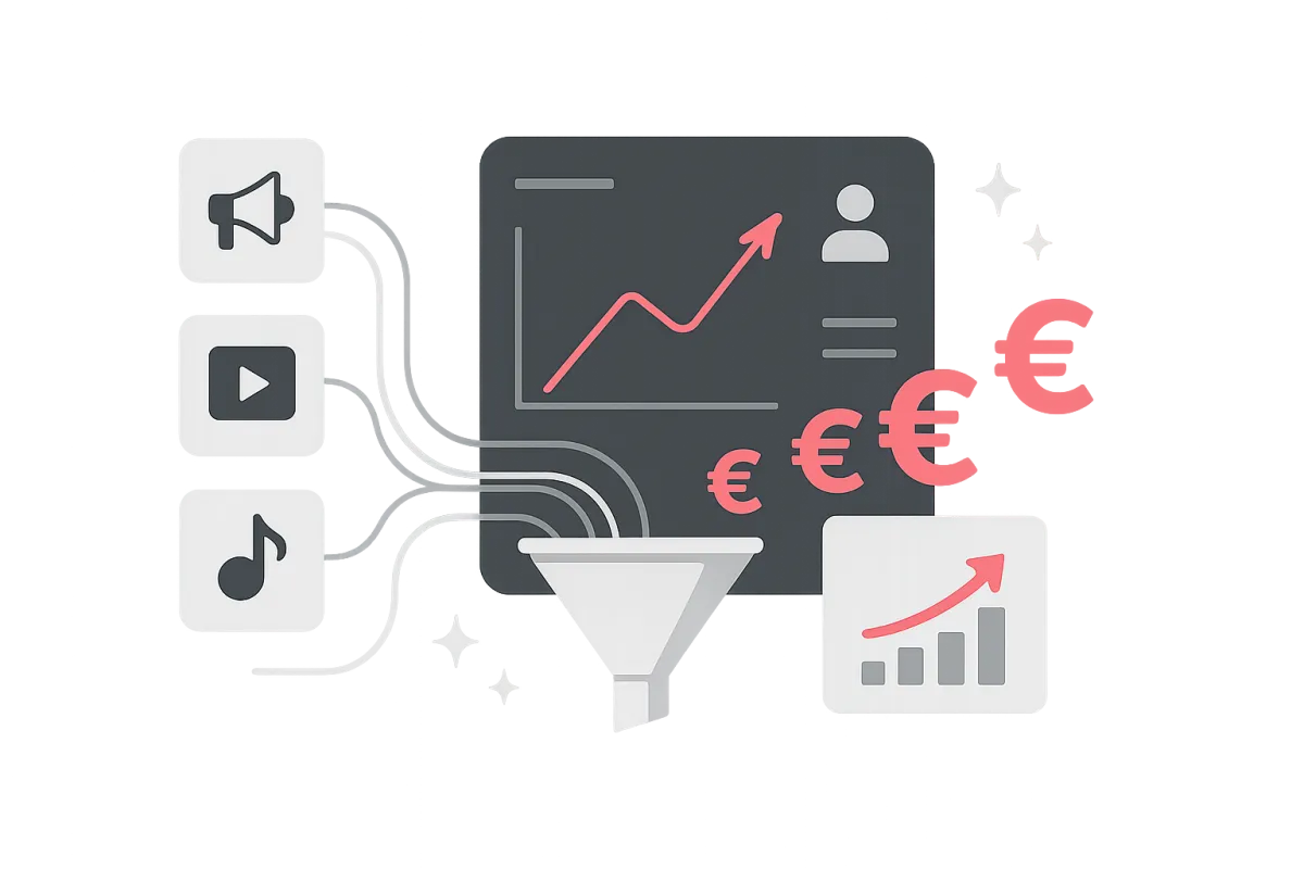 Kokonaisstrategia, joka yhdistää mainonnan, sisällöt ja myynnin tavoitteet.