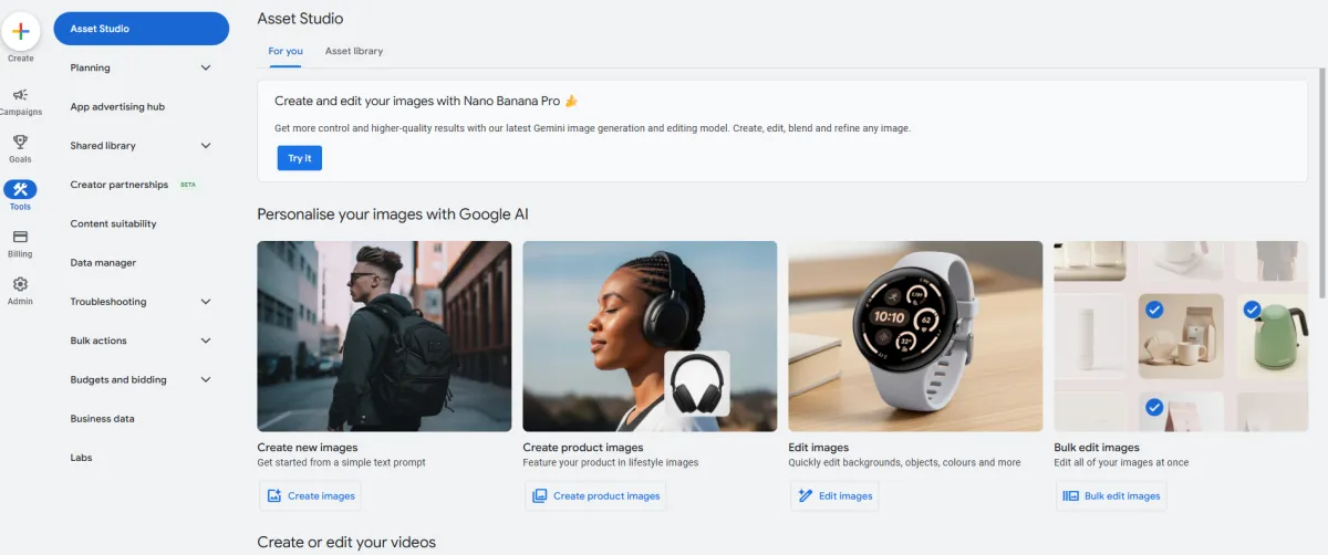 Google on 2025 julkaissut mainosalustalleen jo Asset Studion, jossa voi tehdä promptilla kuvavariaatioita. Lisäksi Pmax ja Demand Gen ovat saaneet rinnalleen hakusanamainonnassa AI Maxin.