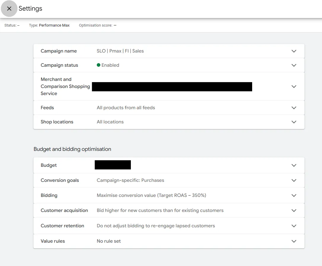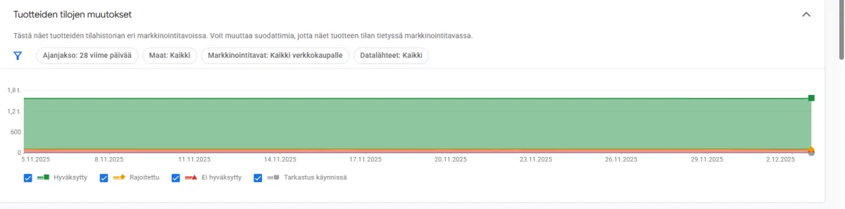 Toinen asia on varmistaa, että Google Merchant Center (GMC) on kunnossa. Sen on sisällettävä ajantasainen tuotesyöte (Feed) ja tuotteiden on pysyttävä hyväksyttyinä ilman massahylkäyksiä.