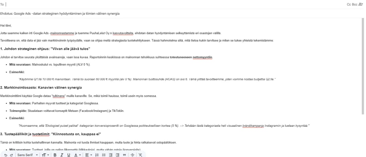2) Markkinointiosasto: Kaipaa tietoa siitä, mitä tuotteita ja kategorioita Googlessa myydään parhaiten, jotta myös muut kanavat (esim. Meta, some) voivat tukea myyntiä.