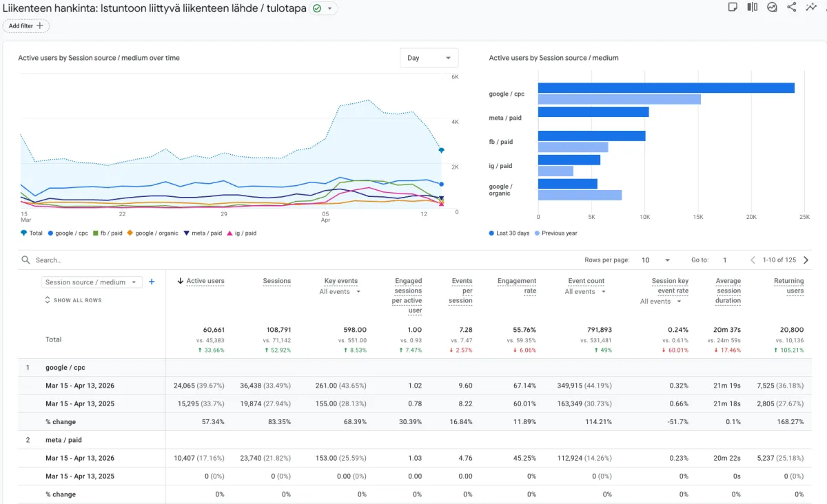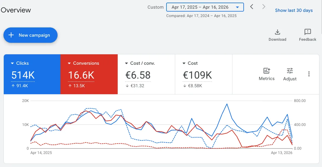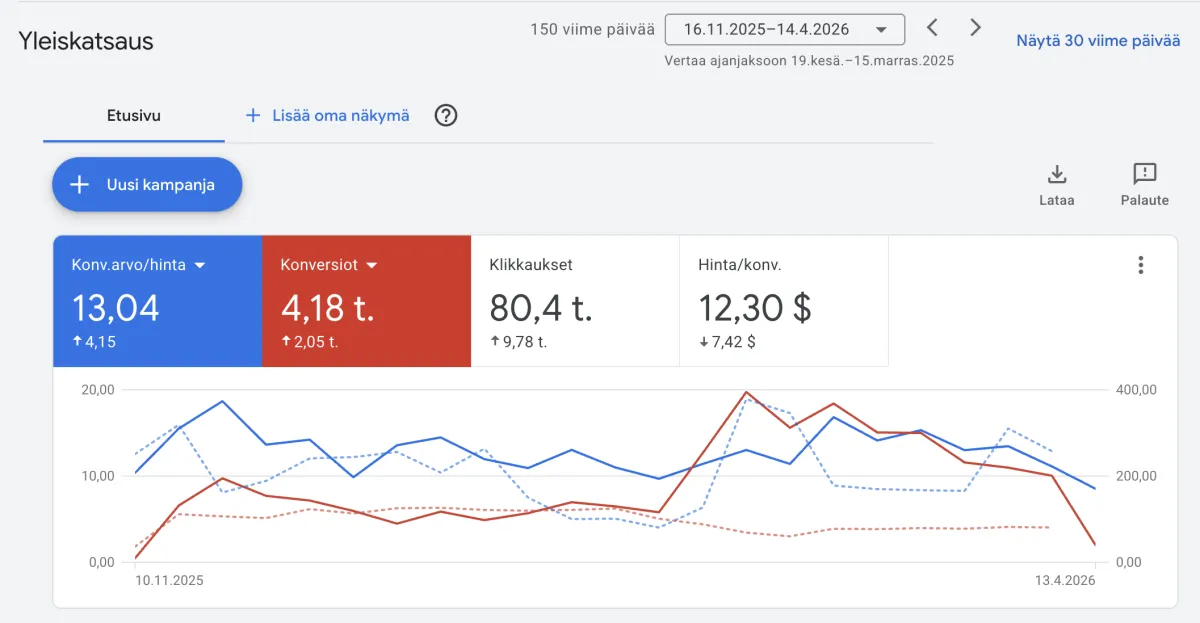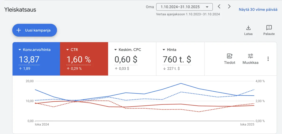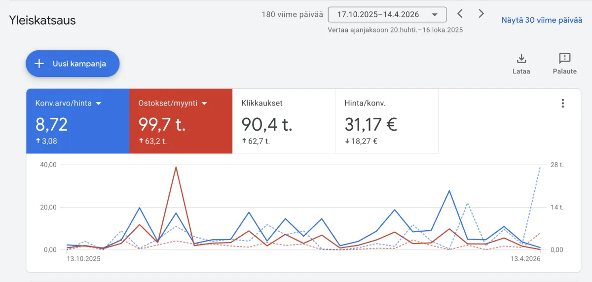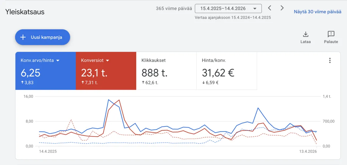 Kotimainen palveluyritys: vuodessa nostimme klikkausmääriä 91,4 tuhatta ja samaan aikaan tiputimme budjettia 8,58 tuhatta euroa.