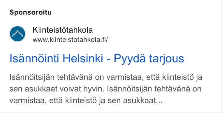 Kohdistimme mainonnan tarkasti maantieteellisesti niiden kaupunkien ympärille, joissa Kiinteistötahkolalla on toimipisteitä, ja varmistimme, että mainokset näkyvät vain virka-aikaan ja iltaisin, jolloin hallitusten jäsenet tyypillisesti hoitavat taloyhtiön asioita.